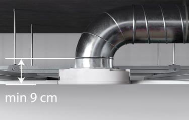 I diffusori ERGOVENT possono essere facilmente collegati a qualsiasi sistema di distibuzione aria con condotti da 100 mm, 125 mm, 150 mm o 160 mm di diametro. Se vengono utilizzati condotti in acciaio, il diffusore può essere collegato direttamente o tramite una tubazione flessibile. Se si utilizza un sistema di distibuzione con tubi flessibili in plastica da 75 mm, il diffusore può essere collegato tramite un plenum standard o mediante un plenum speciale ERGOVENT.